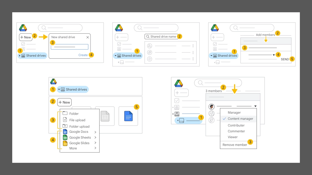 - Shared Drive là không gian lưu trữ chung thành viên có thể tạo để chứa tệp. Các dữ liệu này nằm trong không gian lưu trữ tập thể thay vì Drive riêng của một nhân viên.