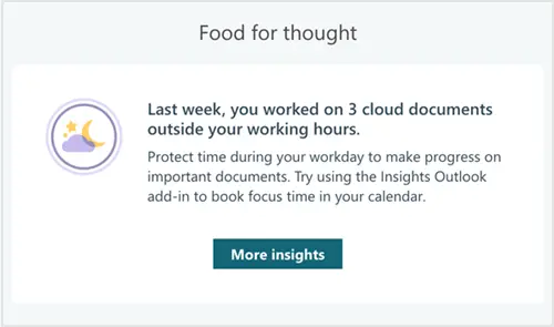 - Phần Email sẽ cho người dùng biết họ dành bao nhiêu thời gian để gửi email cho người khác. Một tiện ích bổ sung (add-on) cho chức năng này cũng có sẵn trên Outlook. Tiện ích bổ sung sẽ cung cấp cho người dùng thẻ hoạt động (activity cards) dựa trên kinh nghiệm làm việc gần đây của họ.